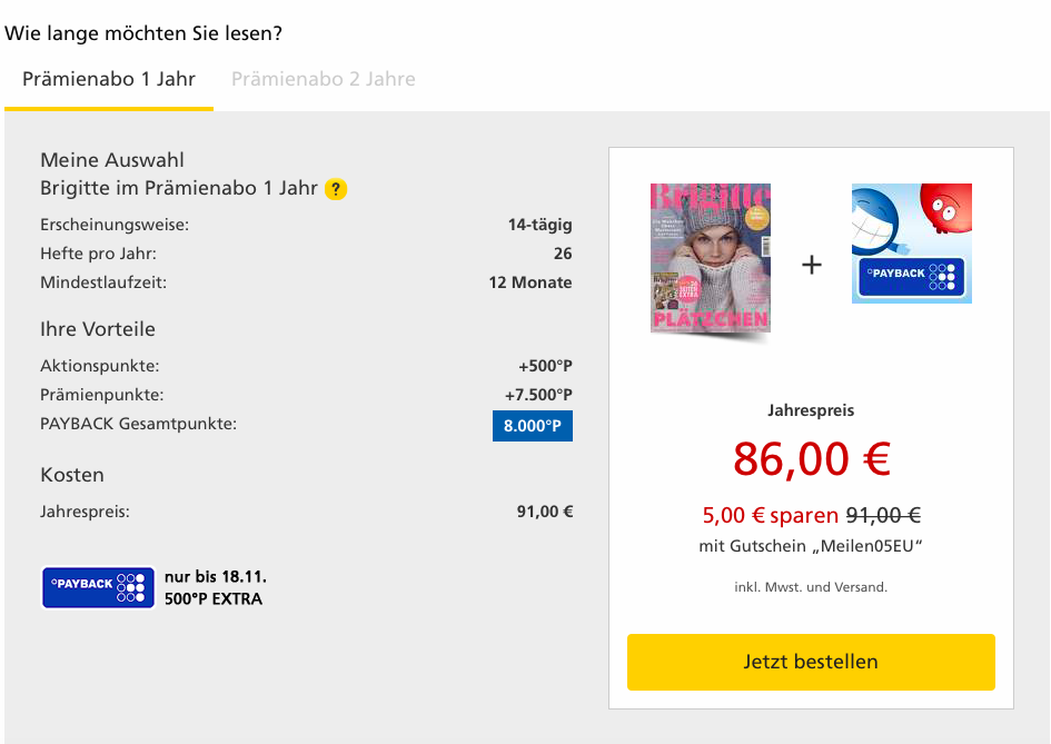 Um für das Abo auch die vollen Miles&More Meilen zu bekommen, müsst Ihr bei der Abo Art „einen neuen Leser werben“ und das 1 Jahres Prämienabo anwählen. Als Prämie wählt Ihr dann 9.500 Payback Punkte. Zusammen mit den 500 Basispunkten für das Abo erhaltet Ihr also jede Menge Payback Punkte und damit Miles&More Meilen.