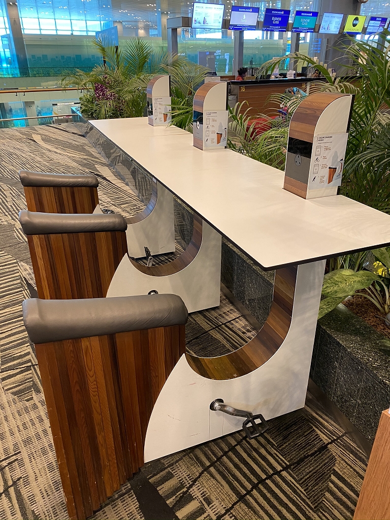 Im Flughafen gibt es auch Ergometer, mit denen man elektrische Geräte aufladen kann. Die Idee finde ich ganz putzig. Und wenn man sich im Transitbereich einmal bewegen möchte, ist das eine schöne Abwechslung zu den Spaziergängen, die man sonst unternehmen kann.