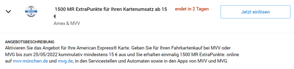 Das Amex Offer der MVV ist noch bis zum 25. Mai 2022 verfügbar. Gebt kumulativ 15 Euro aus und erhaltet 1.500 Membership Rewards Punkte auf Euer Konto gutgeschrieben.
