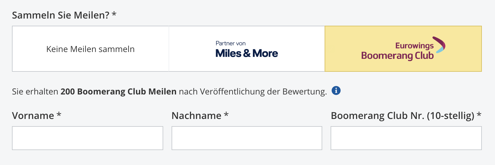 - Die Eingabe Ihrer Miles & More Servicekartennummer erfolgt am Ende der Bewertungsabgabe.