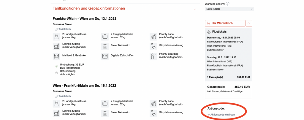 - Der Aktionscode kann nicht für Flüge zwischen dem 21. Dezember 2021 und dem 03. Januar 2022 verwendet werden.