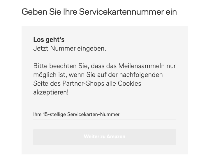 Was für diese Aktion enorm wichtig ist: Einkäufe, die einfach über die App oder Website getätigt werden, können bei der Aktion nicht beachtet werden. Es werden nur Einkäufe beachtet, die über die Miles & More Website getätigt werden. Hierzu einfach auf der Aktionsseite  die Servicekartennummer eingeben und los geht das Powershoppen! Es schadet nie, Weihnachtsgeschenke schon im Oktober zu organisieren – weniger Stress in der Vorweihnachtszeit!