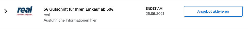 Übrigens findet Ihr in den Amex Offers auch immer wieder andere spannende Angebote von Partnern, mit welchen sich einiges an Geld sparen lässt oder auch manchmal zusätzliche Punkte gewährt werden. So gibt es passend zu dem Shopping Guthaben gerade auch eine AMEX OFFER für die AMEX Gold Karte, bei welcher man für 50 Euro Umsatz bei REAL wieder 5 Euro gutgeschrieben bekommt und dies geht zusätzlich zu den Payback Punkten oder auch den Membership Rewards Punkten, welche man bei REAL bekommen würde. Man sammelt also quasi doppelt Meilen und erhält auch noch Cash Back. Besser geht es schon fast nicht.
