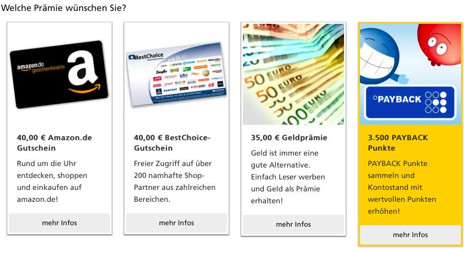 • Der Leserservice hat eine etwas unklare Regelung bezüglich der maximalen Anzahl an Abos “Aktuell hat der Deutsche Post LESERSERVICE seine attraktiven PAYBACK Angebote auf die haushaltsübliche Menge von 3 Bestellungen pro PAYBACK Karte (Hauptkarte inkl. Nebenkarten) limitiert.“   Wie genau diese Regel ausgelegt wird ist unklar, allerdings gibt es einige Beispiele, bei welchen deutlich mehr als drei Abos auf ein Payback Konto abgeschlossen und auch bestätigt wurden. Allerdings gilt wie immer im Leben: Bitte nicht übertreiben!