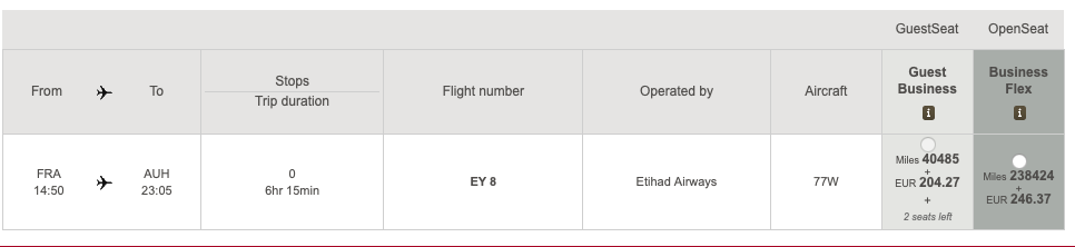Aber auch die fantastischen Etihad Airways First Class Apartments lassen sich mit dieser Aktion für nur 55.030 Meilen von Paris nach Abu Dhabi buchen. Grundsätzlich funktioniert diese Aktion aber auf allen Strecken.