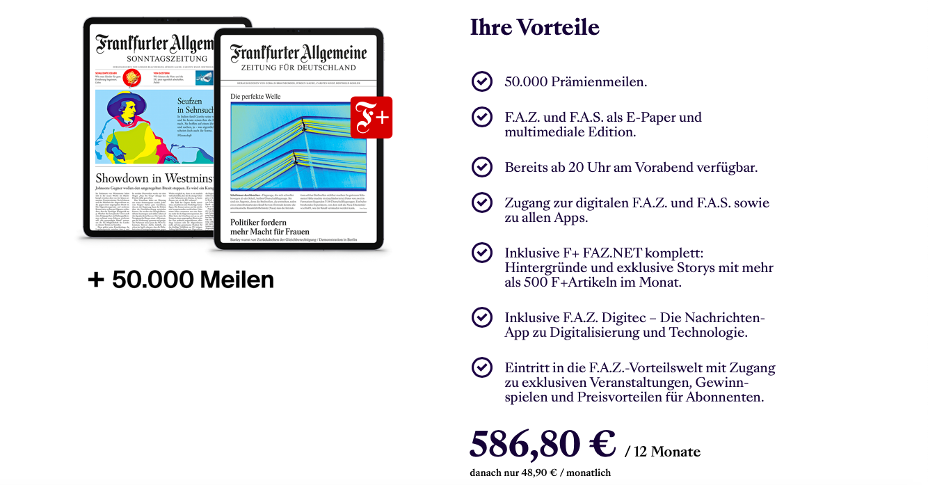 Dieses F.A.Z. Abo ist hier sicher keine Ausnahme und wenn Euch die Zeitung nicht interessiert solltet Ihr sie auch nicht bestellen. Allerdings sind die 50.000 Meilen und die digitale Ausführung, sicher ein interessantes Angebot.