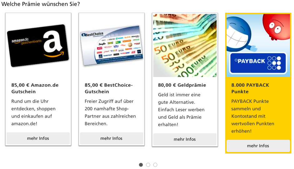 Um für das Abo auch die vollen 5.030 Miles&More Meilen zu bekommen müsst Ihr bei der Abo Art „einen neuen Leser werben“ und das 1 Jahres Prämienabo anwählen. Als Prämie wählt Ihr dann 5.000 Payback Punkte. Zusammen mit den 30 Basispunkten für das Abo erhaltet Ihr also 5.030 Payback Punkte