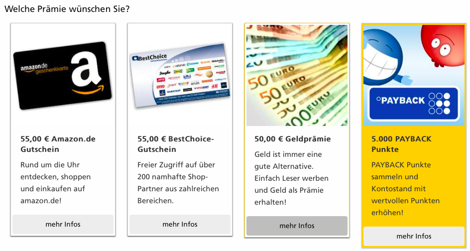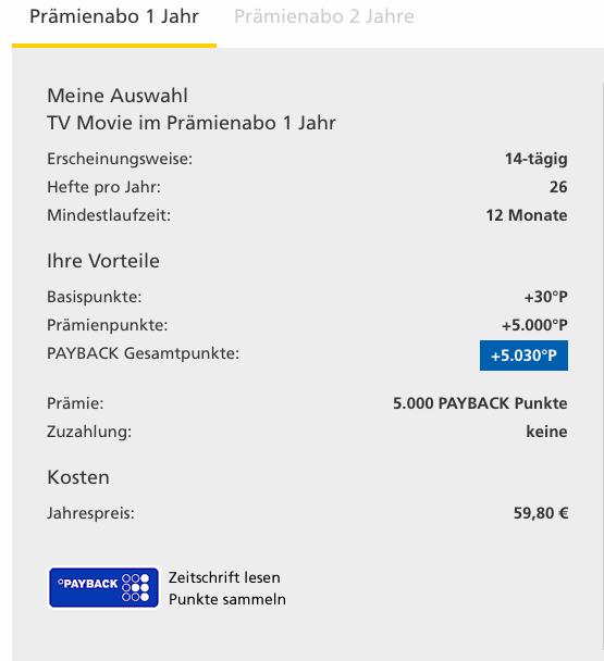 Um für das Brigitte Abo auch die vollen 5.030 Miles&More Meilen zu bekommen, müsst Ihr bei der Abo Art „einen neuen Leser werben“ und das 1 Jahres Prämienabo anwählen. Als Prämie wählt Ihr dann 5.000 Payback Punkte. Zusammen mit den 30 Basispunkten für das Abo, erhaltet Ihr also 5.030 Payback Punkte.