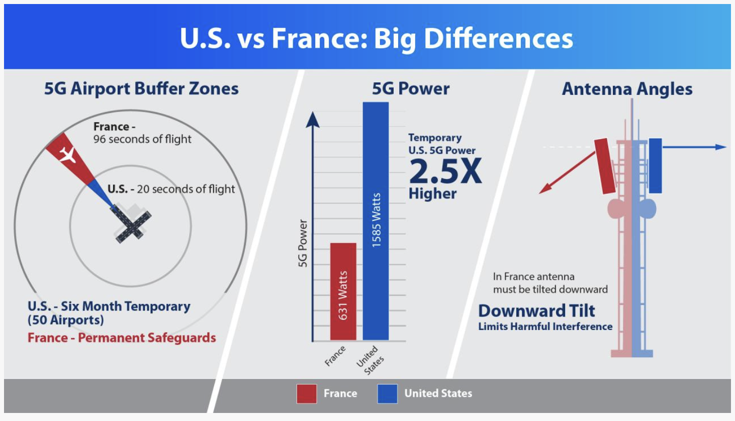 Eines der größten Probleme ist allerdings das Frequenzband, welches man in den USA gewählt hat. Dieses liegt zwar immer noch unterhalb der für den Luftverkehr reservierten 4,0 bis 4,2 GHz, allerdings ist man mit 3,7-3,98GHz doch erstaunlich nah an diesem Frequenzen. In Europa bewegt man sich zwischen 3,3 und 3,8 GHz um hier einen Sicherheitsabstand zu haben.