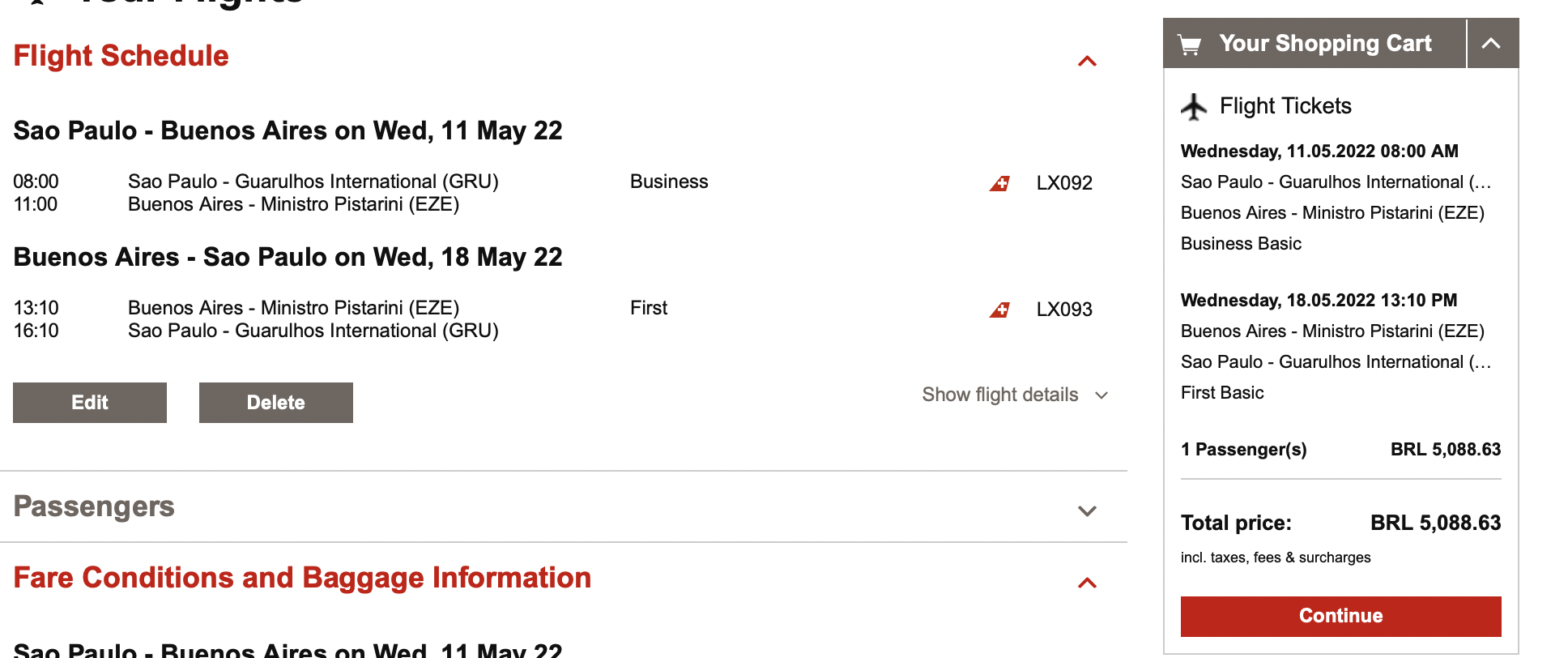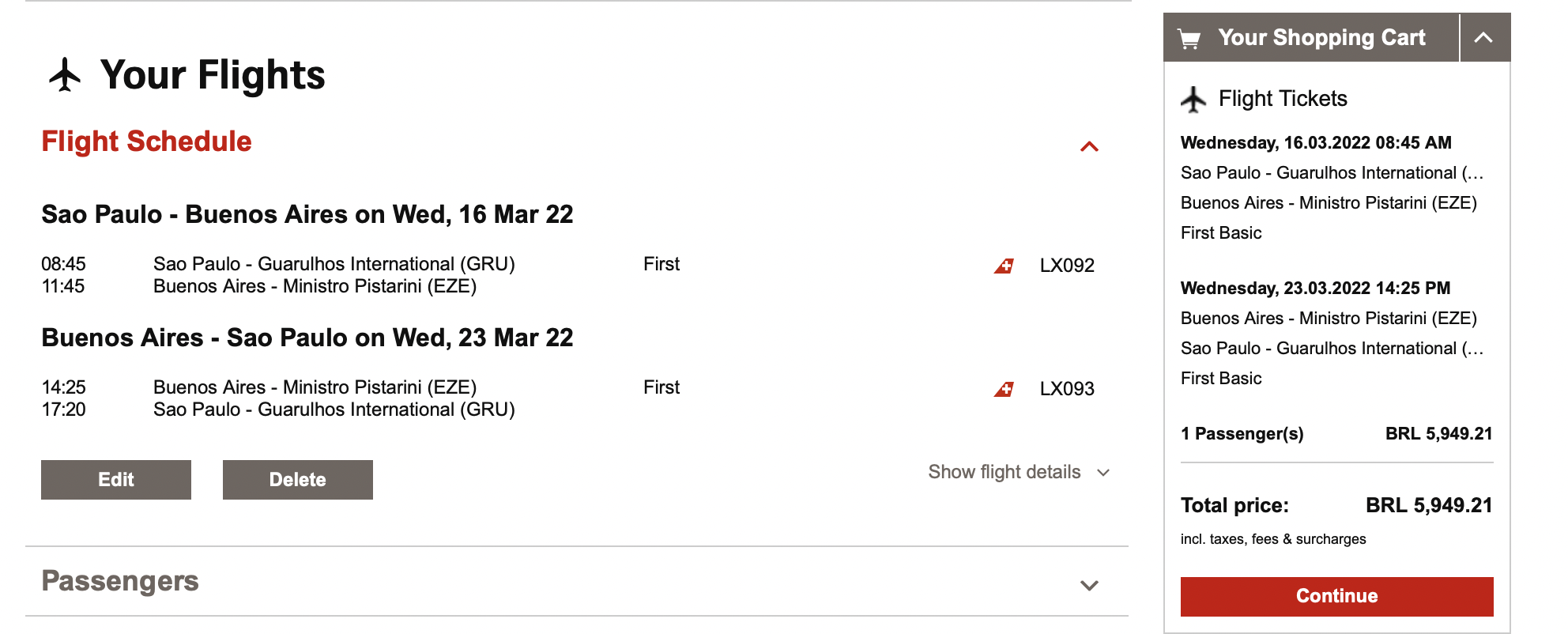 Seit kurzem fliegt Swiss zweimal pro Woche auf der Strecke und bietet hier auch alle Reiseklassen, inklusive der First Class an. Das Besondere an diesem Flug ist, dass Swiss hier auch die Rechte der fünften Freiheit besitzt, was ihr erlaubt Passagiere und Fracht auch ausschließlich zwischen Sao Paulo und Buenos Aires zu transportieren.