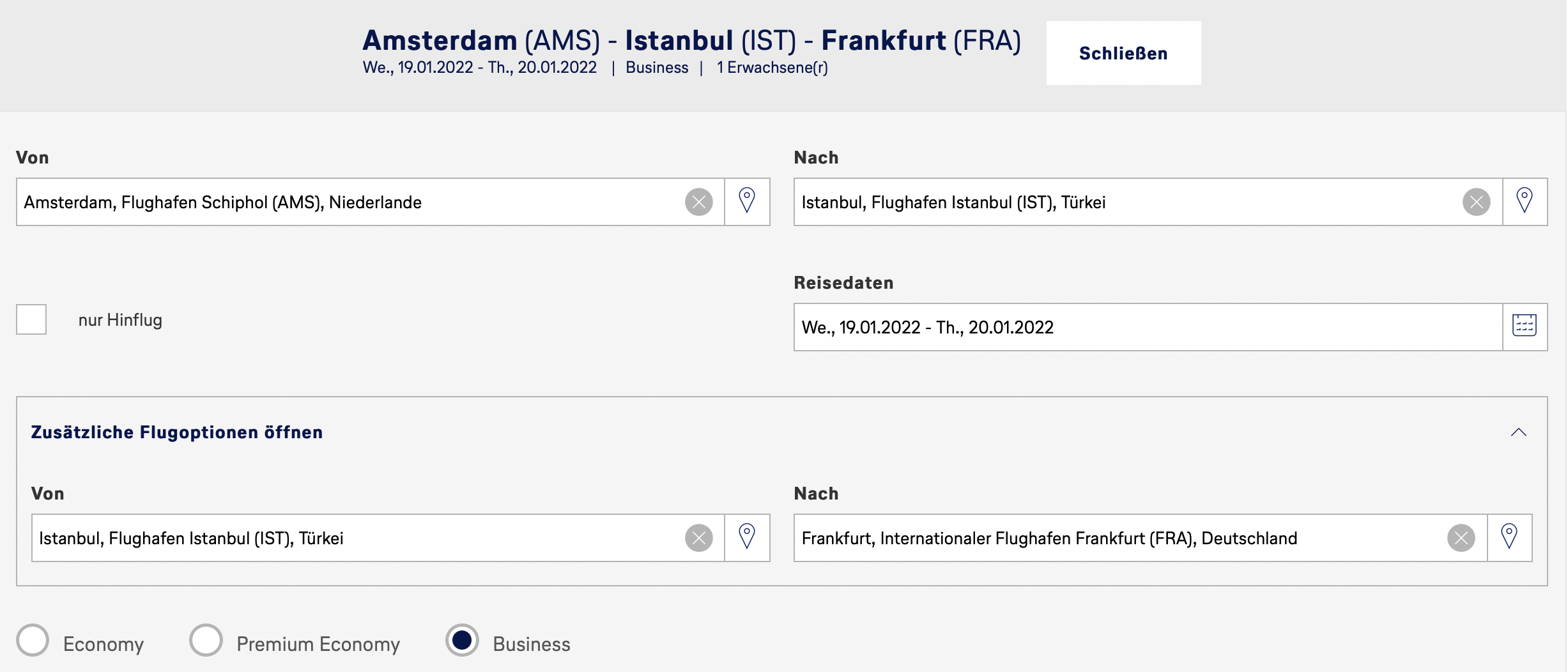 In unserem Beispiel suchen wir Amsterdam nach Istanbul und Istanbul nach Frankfurt als Gabelfug mit einem Aufenthalt von einer Nacht in Istanbul.