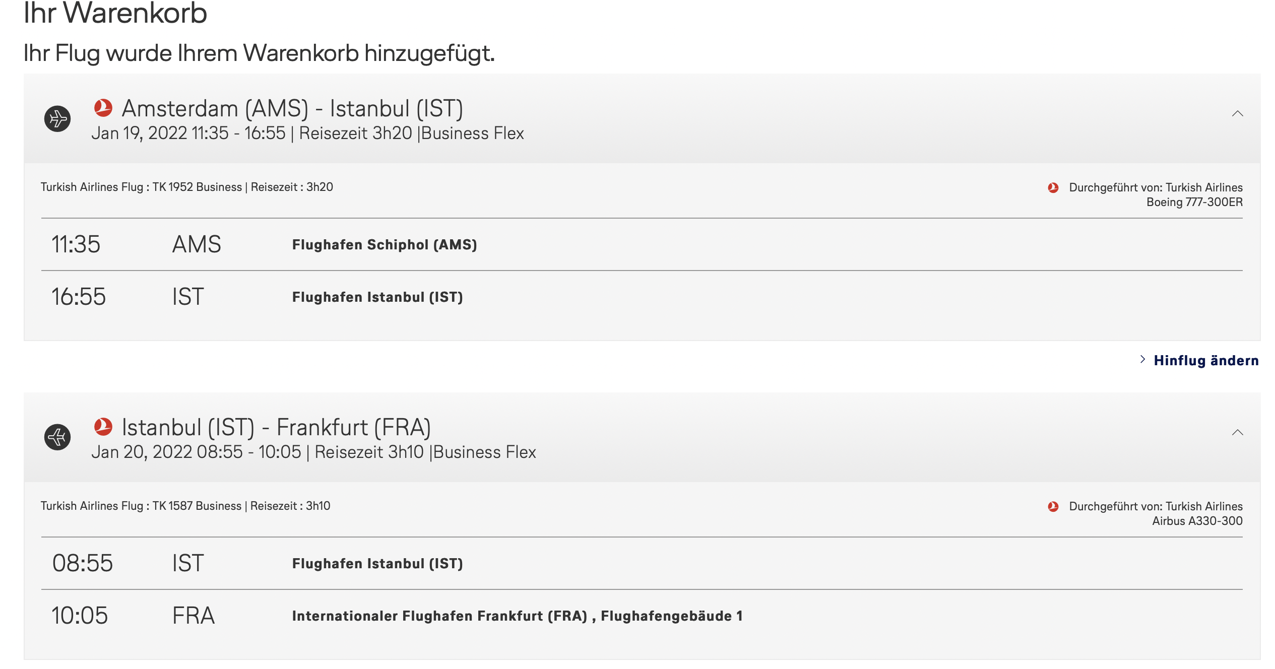 In unserem Beispiel kann man z.B. von Amsterdam nach (über) Istanbul, weiter nach Frankfurt fliegen und hierbei Flüge in der Langstrecken Business Class der Boeing 777-300er (dem größten Flugzeug von Turkish Airlines) und dem Airbus A330-300 genießen.