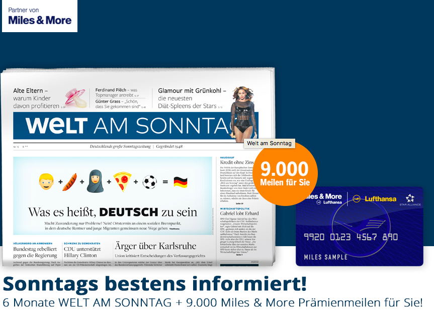 Immer wieder gibt es Zeitungsabos, bei welchen man eine recht stattliche Anzahl an Miles&more Meilen sammeln kann. Momentan bietet die Welt am Sonntag ein 6-Monats Abonnement an, mit welchem Ihr 9.000 Miles&More Meilen für 109,20 Euro sammeln könnt. Besonders interessant an diesem Abonnement ist, das es keine „Sperrfrist“ in den AGBs gibt.