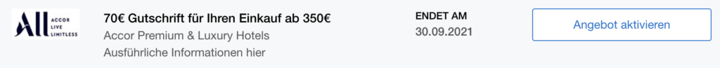American Express bietet im Rahmen der AMEX Offers immer wieder spannende Aktionen mit Cashback oder Extra-Punkten an. Bei einigen Teilnehmern wurde in den vergangenen Tagen eine Promo einiger Accor-Hotels geschaltet. Bei einem Umsatz von 350€ schreibt Euch American Express nach der Transaktion in den teilnehmenden Häusern 70€ auf  dem Kartenkonto gut. Ob Ihr berechtigt seid, könnt Ihr in dem Online-Konto sehen, wo auch gleichzeitig die Aktivierung erfolgt.