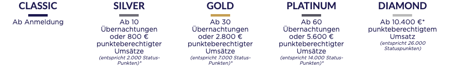 Damit werden die Anforderungen zum Erreichen eines Status sowie dessen Erhalt halbiert. Die Silber-Stufe gibts also im neuen Jahr schon nach 5 Nächten. Die Berechnung der erforderlichen Statuspunkte ist etwas komplizierter, da einige Marken abweichende Werte vergeben. Weitere Informationen und einen Punkterechner sind auf der Website veröffentlicht.