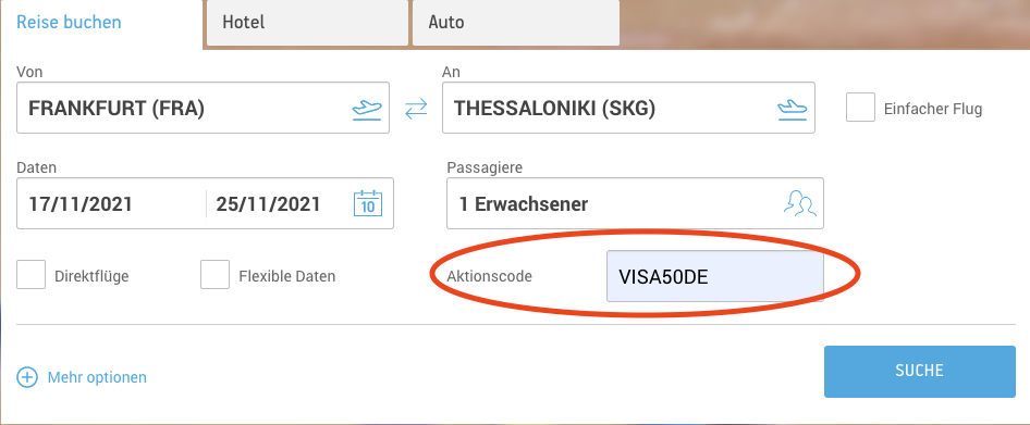 Benutzen Sie einfach den Aktionscode VISA50DE während Ihrer Buchung für Ihren nächsten Flug im Zeitraum.