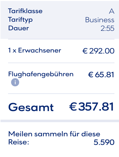 Noch mehr Meilen kommen bei einer Umsteigeverbindung zusammen. Bei einem Trip nach Rhodos über Athen sind wir schon bei fast 20.000 Prämienmeilen- bei einem Flugpreis von ca. 153€. Auch Flüge in der Business Class können sich lohnen, ein Roundtrip nach Thessaloniki kostet zwar knapp 360€, dafür gibt es einen komfortablen Trip und ganze 33.540 Meilen!
