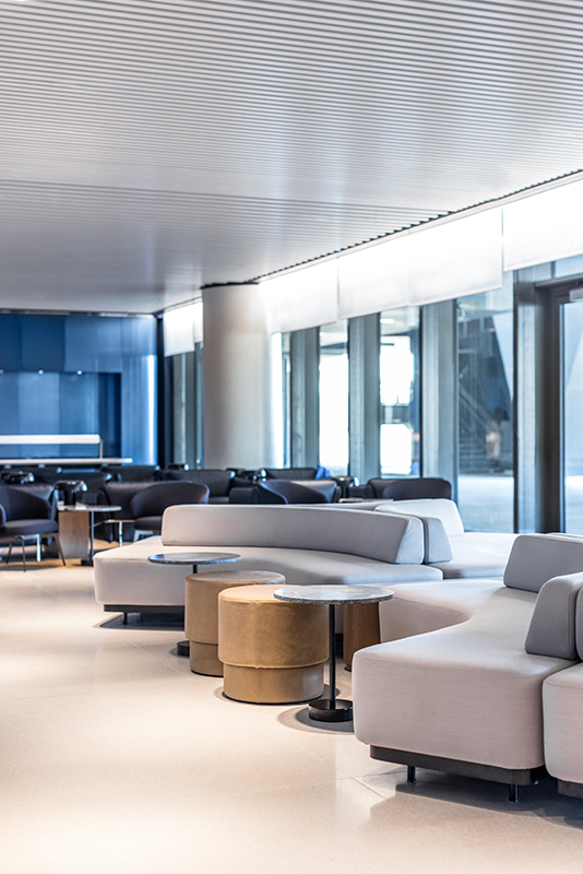 Das Interieur wurde an den neugestalteten Flughafen angepasst und wirkt sehr modern. Es wurden Materialien wie Marmor, Glas und Holz verwendet, die großen Fenster sorgen für eine helle Atmosphäre.