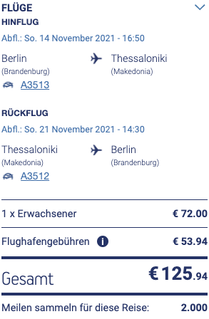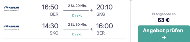 Wir haben einige günstige Tarife bei Skyscanner gefunden. So zum Beispiel den Flug von Berlin nach Thessaloniki, dieser ist dort sogar etwas günstiger als auf der Homepage von Aegean selbst: