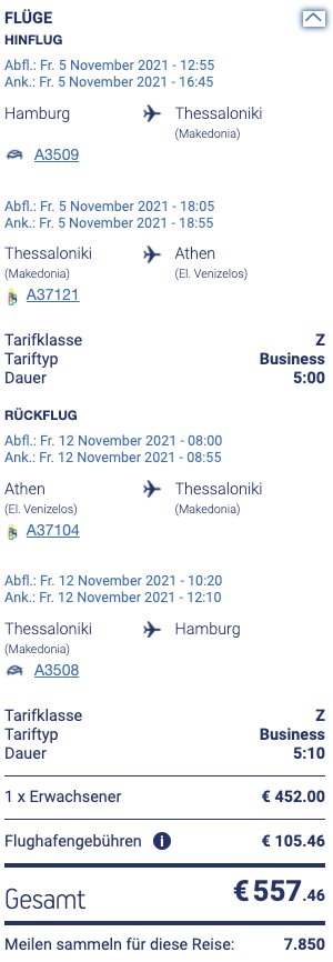 Einfachere Umsteigeverbindungen wie z.B. zu einem Ziel innerhalb von Griechenland findet man wiederum direkt bei der Airline. Hier ein Beispiel mit vier Segmenten in der Business Class, welches fast 8.000 Statusmeilen generiert: