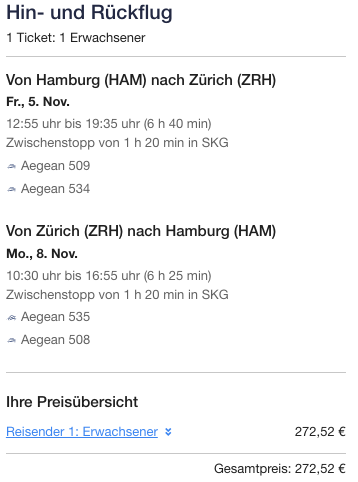 Der Trip von Hamburg über Thessaloniki nach Zürich generiert vier Segmente und 4.180 Statusmeilen in Economy. Reisen in der Business Class gibt es bei Direktverbindungen ab ca. 300€: