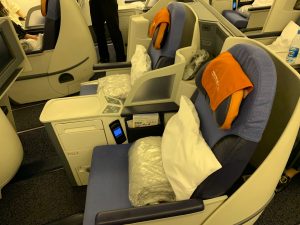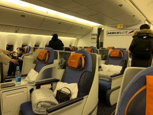 Ich hatte die Gelegenheit im Februar 2019 zum ersten Mal in der Aeroflot Business Class zu fliegen. Nach einem Kurzstrecken-Flug mit echten Business Class Sitzen von Warschau nach Moskau, ging es mit der Boeing 777 weiter nach Seoul. Da wir als Paar unterwegs waren, machte uns die 2-2-2-Bestuhlung nichts aus. Eigentlich kam sie uns sogar ganz recht, denn man sitzt schon näher beieinander als beispielsweise bei Fluggesellschaften mit Reverse Herringbone-Sitzen.