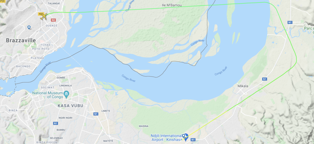 Geografisch gelten Brazzaville und Kinshasa als die am nächsten gelegenen Hauptstädte der Welt, diese sind nur durch den Kongo-Fluss getrennt. BZV und FIH sind die Airports der Hauptstädte von der Republik Kongo (RoC) und der Demokratischen Republik Kongo (DRC). Die Flugzeit ist planmäßig mit 40 Minuten angegeben, selbst mit Rollzeit wird dieser Wert zum Teil deutlich unterschritten.