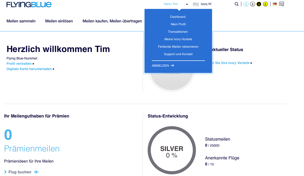 - Meldet Euch bei Flying Blue an. Das könnt Ihr hier tun.