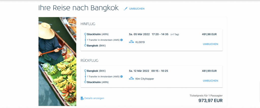 Wer einen kleinen Umweg nicht scheut, der kann aktuell ab Stockholm sehr günstige Business Class Tickets in der KLM oder Air France Business Class nach Bangkok buchen und erhält den Hin- und Rückflug ab 973 Euro, was sicherlich ein absoluter Kampfpreis ist.