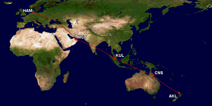 Das markant lackierte Flugzeug steht derzeit noch in Hamburg und soll voraussichtlich im November überführt werden. Die knapp 18.000 km lange Rote nach Auckland wird über Maskat, Kuala Lumpur und Cairns führen.