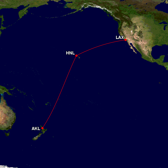 Dann findet der Erholungsaufenthalt nach dem etwa 7.000km-Flug von Auckland nach Honolulu auf Hawaii statt. Dort bleiben die Crews drei Tage lang im Hotel. Gleichzeitig übernimmt eine neue Besatzung die Maschine und fliegt die gut 4.100km weiter nach Los Angeles. Dort steigen die Fluggäste aus, die Fracht wird ausgeladen. Die gleiche Crew bleibt an Bord und fliegt mit neuen Passagieren und Beladung am selben Tag zurück nach Honolulu. Dort wechselt wieder die Crew erneut.