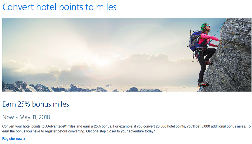 Zusätzlich zu der aktuellen Aktion, bei welcher man SPG Starpoints mit 35% Rabatt kaufen kann, bietet American Advantage aktuell auch eine eigene Aktion, bei welcher man einen zusätzlichen 25% Bonus auf den Transfer von Hotelpunkten in American Advantage Meilen bietet (achtet darauf, dass die American Airlines Seite auf die Ländereinstellung, USA, eingestellt ist). Beide Aktionen laufen noch bis zum 31. Mai und sind miteinander kombinierbar.