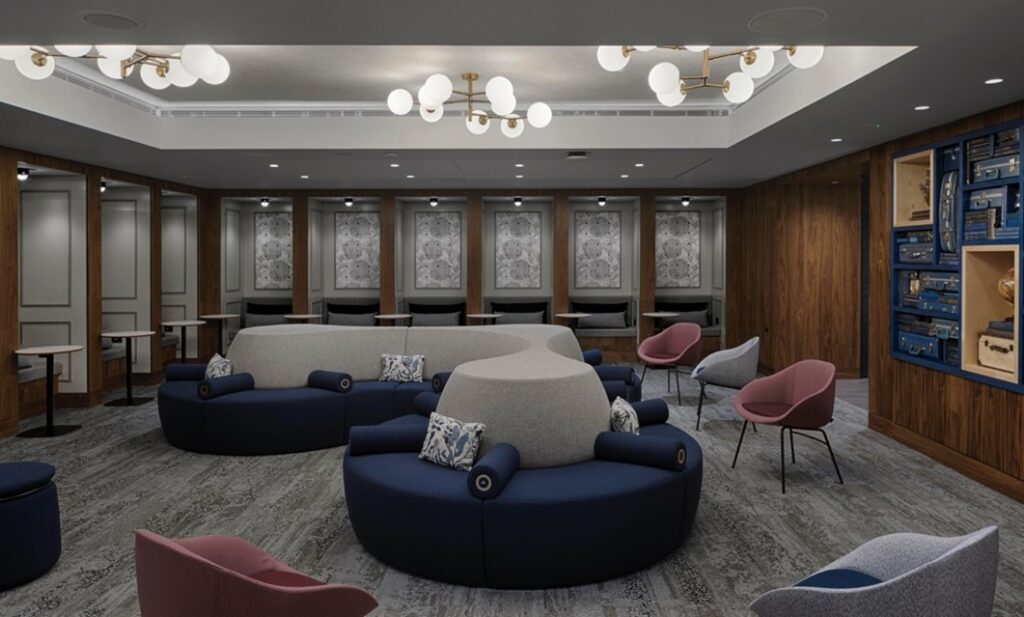 Wer in der Lounge länger verweilen will und kann, wird sich hier im Loungebereich ausruhen können. Aber auch Arbeitsbereiche gibt es in der American Express Centurion Lounge in London Heathrow.