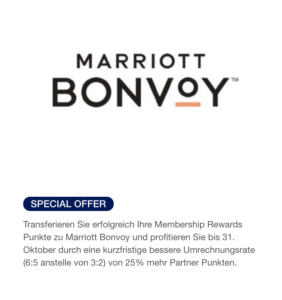 Beim Transfer zu Marriott Bonvoy gibt es noch bis Ende Oktober einen Bonus von 25% auf die Punkte. Richtig eingesetzt könnt Ihr damit einen erheblichen Mehrwert aus den Membership Rewards erzielen.