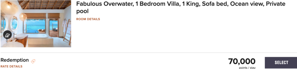 Die Preise für eine Nacht liegen bei etwa 750US$. Dafür gibt es einen Overwater-Villa mit eigenem Privatpool. Diese ist auch mit Punkten buchbar und kostet genau 70.000 Bonvoy-Punkte.