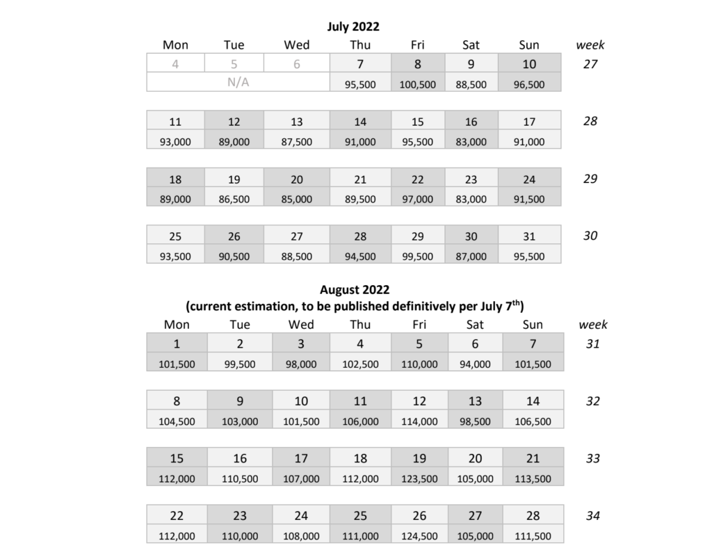 Der Flughafen von Amsterdam hat eine Tabelle veröffentlicht, welche die erwarteten Passagierzahlen für den Juli und August zeigt und man sieht hier deutlich wie stark man über dem Passagier Maximum liegt und damit auch wie viele Passagiere hier betroffen sind.