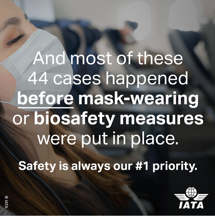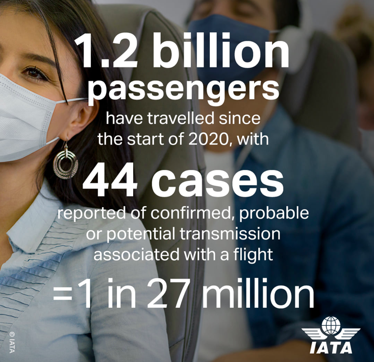 Nur in 44 Fällen konnte eine Infektion auf den Flug zusammen mit einer infizierten Person zurückgeführt werden und fast alle dieser Infektionen sind vor April geschehen, als es in Flugzeugen noch keine Maskenpflicht gab. Seither sind kaum noch Fälle bekannt.