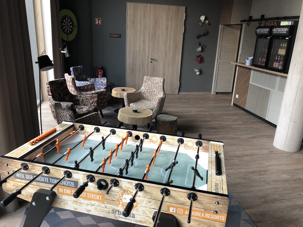 Im gut und natürlich durchleuchteten Untergeschoss verfügt das Hotel zudem über verschiedene Meetingräume. Auch einen eigenen Pausenraum mit Getränkespendern, Sitzgelegenheiten und einem Kickertisch gibt es hier.