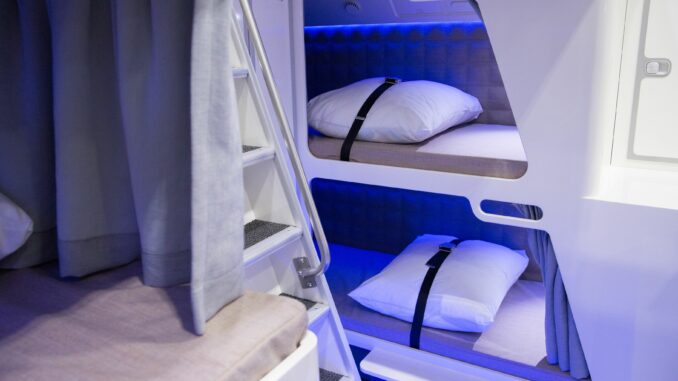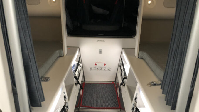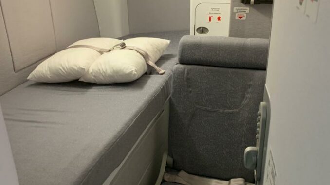 Auf jeden Fall hat das Schlafzimmer der Besatzung etwas von einem Mysterium. Einblicke gibt es nur selten, die Zugangstüren sind außerdem im Verborgenen oder gut getarnt. Wenn man genau darauf achtet, sieht man aber im Kabinenboden eine Notausstiegstür. Diese kann auch als Ablagefach für Handgepäck getarnt sein- je nachdem ob das Crewrest unter oder über den Passagieren ist.