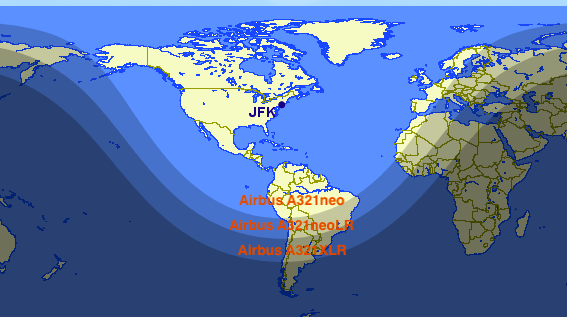 Wenn man sich die Reichweite der Flugzeuge ab New York ansieht wird schnell klar, welche Möglichkeiten sich hier für die noch recht junge Airline auftuen.