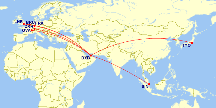 Eine Analyse zeigt, dass Emirates die neuen Triple Seven fast durchgängig auf folgenden Strecken einsetzt: