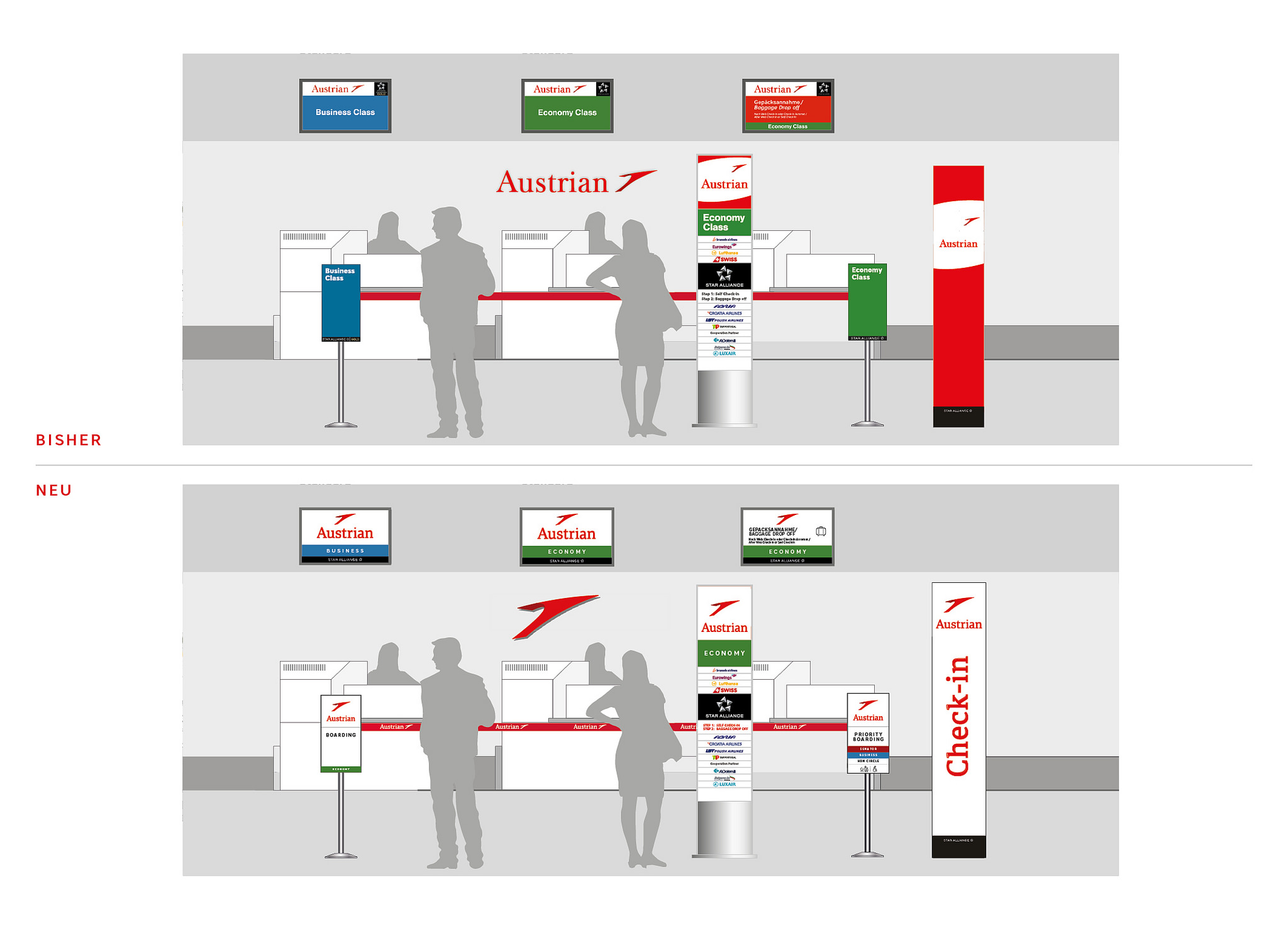 Aber auch die Austrian Airlines Check-In Schalter werden etwas umgestaltet. So wird man hier mehr Rot auf weißem Grund sehen, statt Weiß auf rotem Grund. Ich finde, dass die Check-In Schalter so etwas freundlicher wirken.