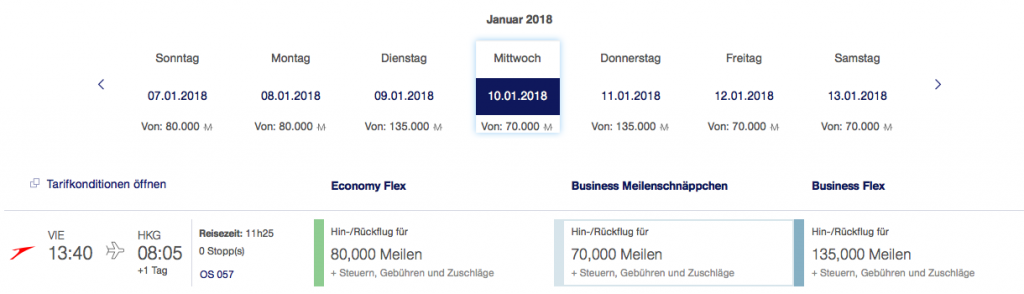 Nach Hongkong lassen sich sowohl im Dezember, als auch im Januar an einigen Tagen Meilenschnäppchen finden. Die Verfügbarkeit ist mittelmäßig und leider nicht täglich.