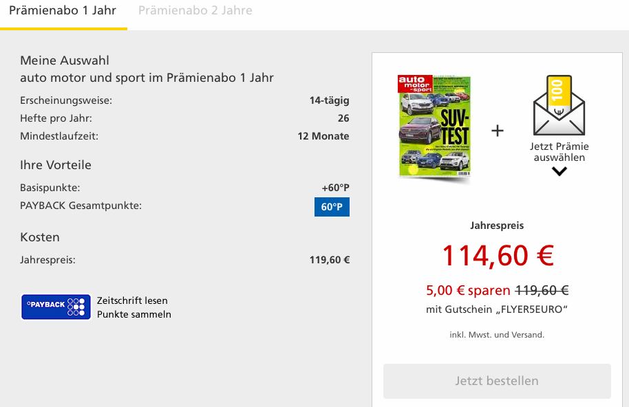 Um für das Auto, Motor und Sport Abo auch die vollen 9.560 Miles&More Meilen zu bekommen müsst Ihr bei der Abo Art „einen neuen Leser werben“ und das 1 Jahres Prämienabo anwählen. Als Prämie wählt Ihr dann 9.500 Payback Punkte. Zusammen mit den 60 Basispunkten für das Abo erhaltet Ihr also 9.560 Payback Punkte.