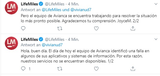 Alarmierend war es daher, dass seit Sonntag nichts mehr bei Avianca Lifemiles ging. Während die normale Seite der Fluggesellschaft noch sauber lief, wurde die Webseite zum Meilenprogramm abgestellt. Rufte man lifemiles.com auf, wurde man lediglich von einer kurzen Nachricht „wir arbeiten an weiteren Vorteilen“ begrüßt. Dass dies nicht der ganzen Wahrheit entsprach, ließ sich dem Twitter-Account @lifemiles entnehmen. Dort beantwortet das Social Media-Team entsprechende Anfragen anderer Twitter-Nutzer mit technischen Problemen. Das macht auch mehr Sinn, wenn eine komplette Webseite ohne Vorankündigung in den Wartungsmodus gesetzt wird.