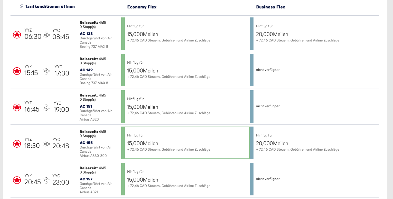 Während Montreal, Toronto und Vancouver von Lufthansa selbst angeflogen werden und hier in der Business Class gute Verfügbarkeiten an Prämienflügen bieten, sieht es nach Calgary leider nicht so gut aus. Hier finde ich aktuell nur Prämienflüge und der Economy Class, allerdings werde ich auch diese Situation beobachten.