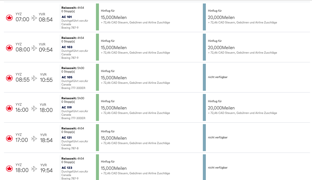 Übrigens auch auf den Trans Kanada Flügen von Toronto nach Vancouver, auf denen die Boeing 787 mit Langstreckenbestuhlung eingesetzt wird, findet man durchaus Verfügbarkeiten: