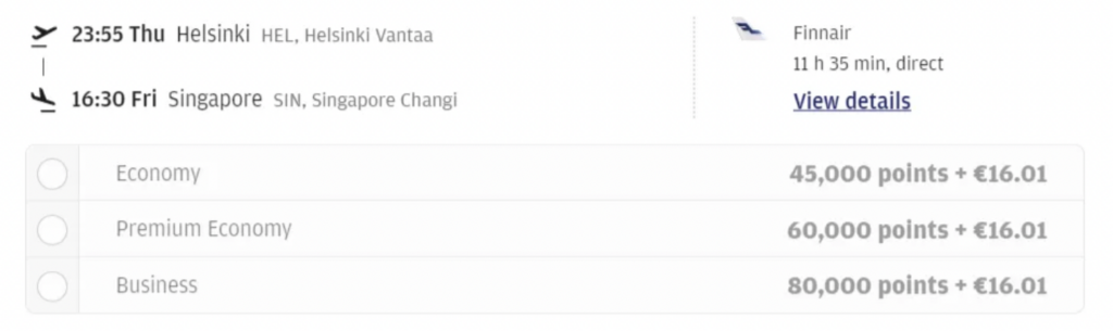 Ein weiterer Vorteil von Prämienflügen bei Finnair ist, dass die Steuern und Gebühren hier sehr niedrig sind. Für einen Flug von Helsinki nach Singapur fallen z.B. nur 16 Euro an.