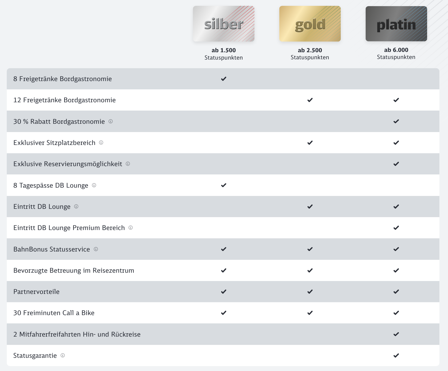 Platin-Mitgliedern wird ein Status auch nach dem Verlust des Levels garantiert, so bleibt nach dem Downgrade mindestens die silberne Stufe erhalten. Dafür müssen Vielfahrer im Berechnungszeitraum von 12 Monaten allerdings auch Fahrkarten für 6.000€ kaufen.