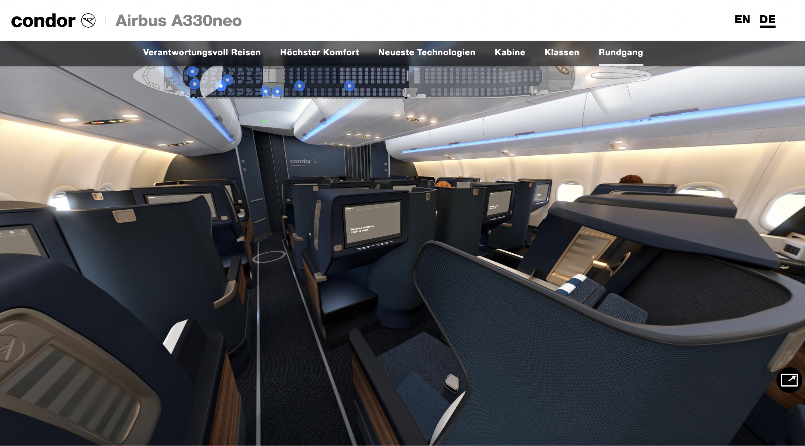 Auf der Condor Webseite findet man etwas versteckt eine Informationsseite zum neuen Airbus A330-900neo, welche allerhand interessante Informationen zu dem neuen Flugzeug enthält. Darunter auch einen virtuellen Rundgang durch die Kabine, welcher durchaus interessant ist.